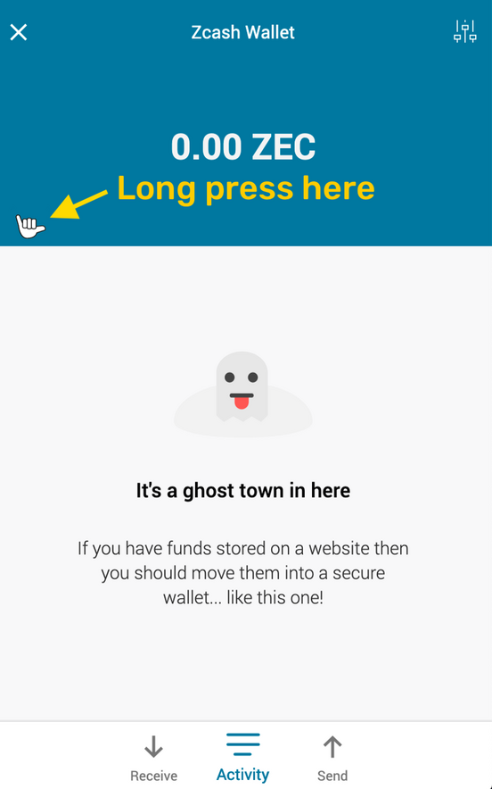 3. Open up your created or imported Zcash wallet in the SafePay app and long press on the Ycash logo, this will open up the wallet creator.