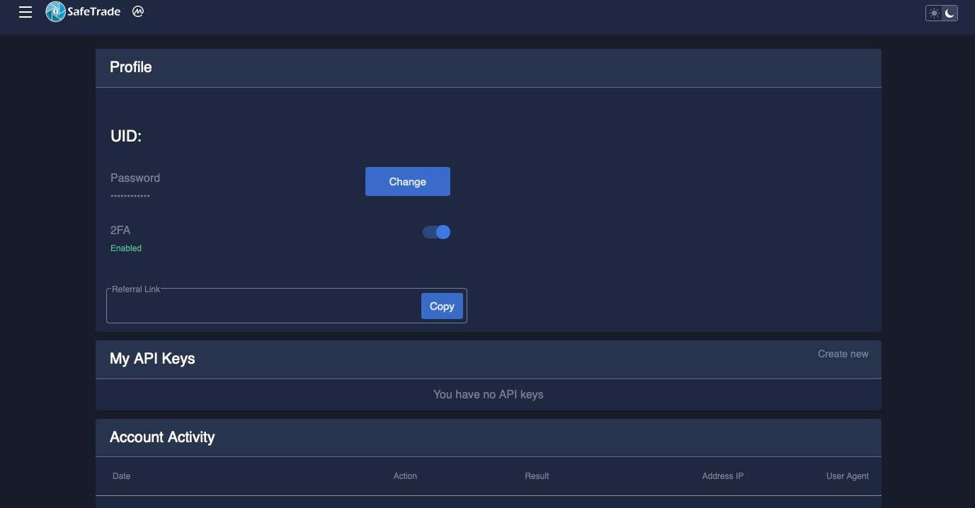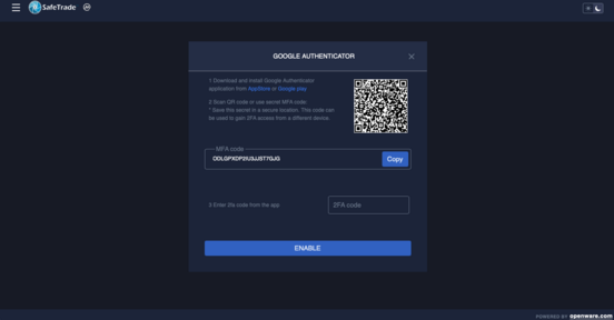 - To check, if your authentification was successful, you can have a look at your profile in the 2FA section. If it says "enabled" in green letters, your wallet is ready for deposit and withdraw – and thus for buying SafeCoins on SafeTrade.