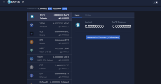- You will then see the cryptocurrencies that can be traded on SafeTrade. Also, on the right side of your screen, your wallet will show you how much of each cryptocurrency you own and the options for withdraw and deposit.