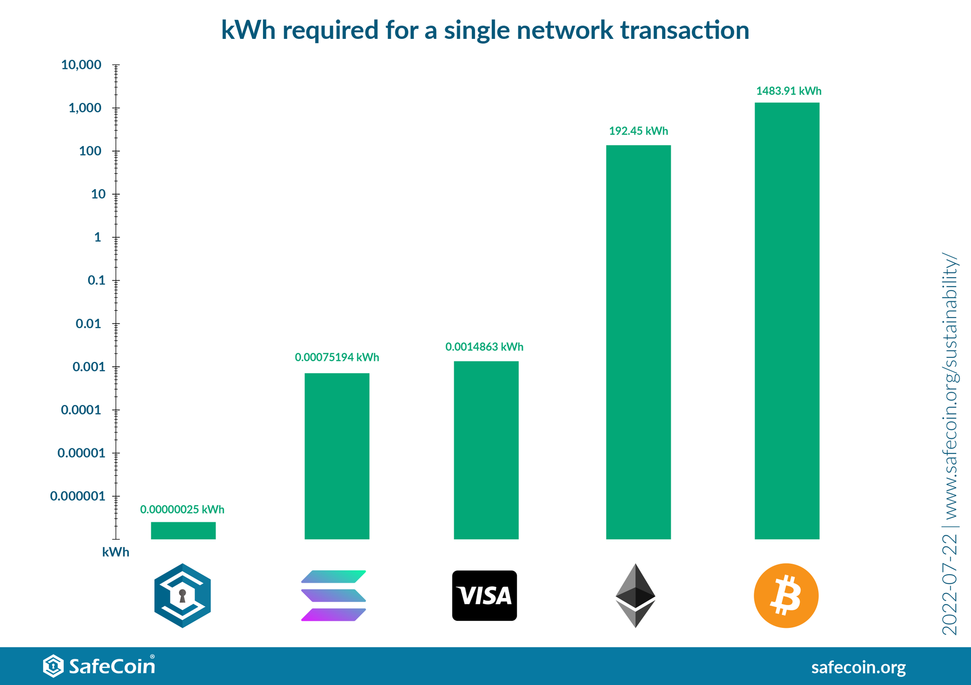 A regular AA Battery with 0.00444 kWh (2.96Ah with 1.5V) capacity could power 17,760 SafeCoin transactions, almost 6 Solana transactions, and 3 VISA transactions. Yet, for a single Bitcoin transaction, one would need at least 334,213 batteries.